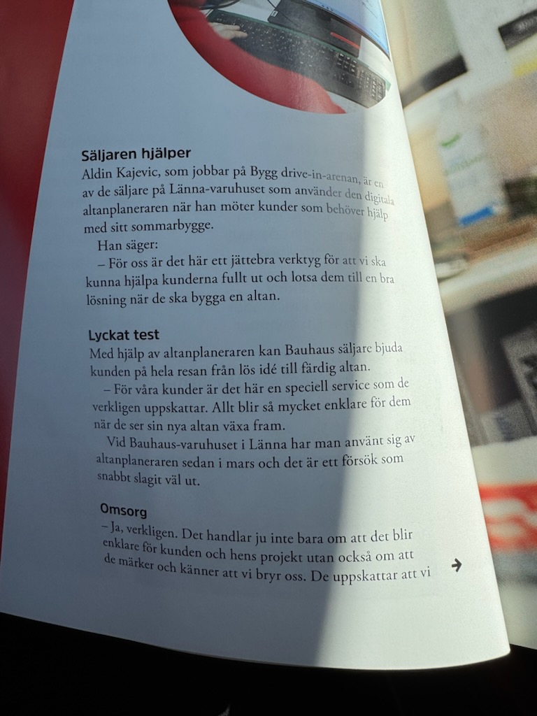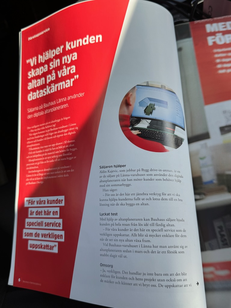 Visste du att butikssäljarna på BAUHAUS använder Altanplaneraren i sin företagsservice för att rita, skapa materiallistor och ladda ner ritningar till kunderna? Nyligen skrev de om samarbetet i sitt magasin Proffset – något vi så klart är stolta över.