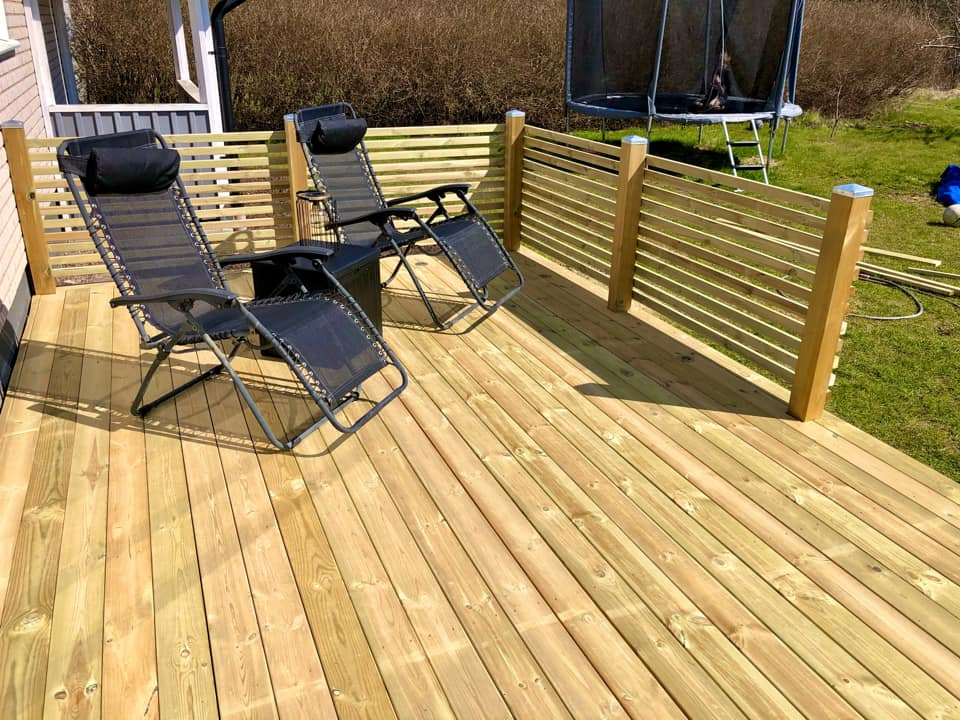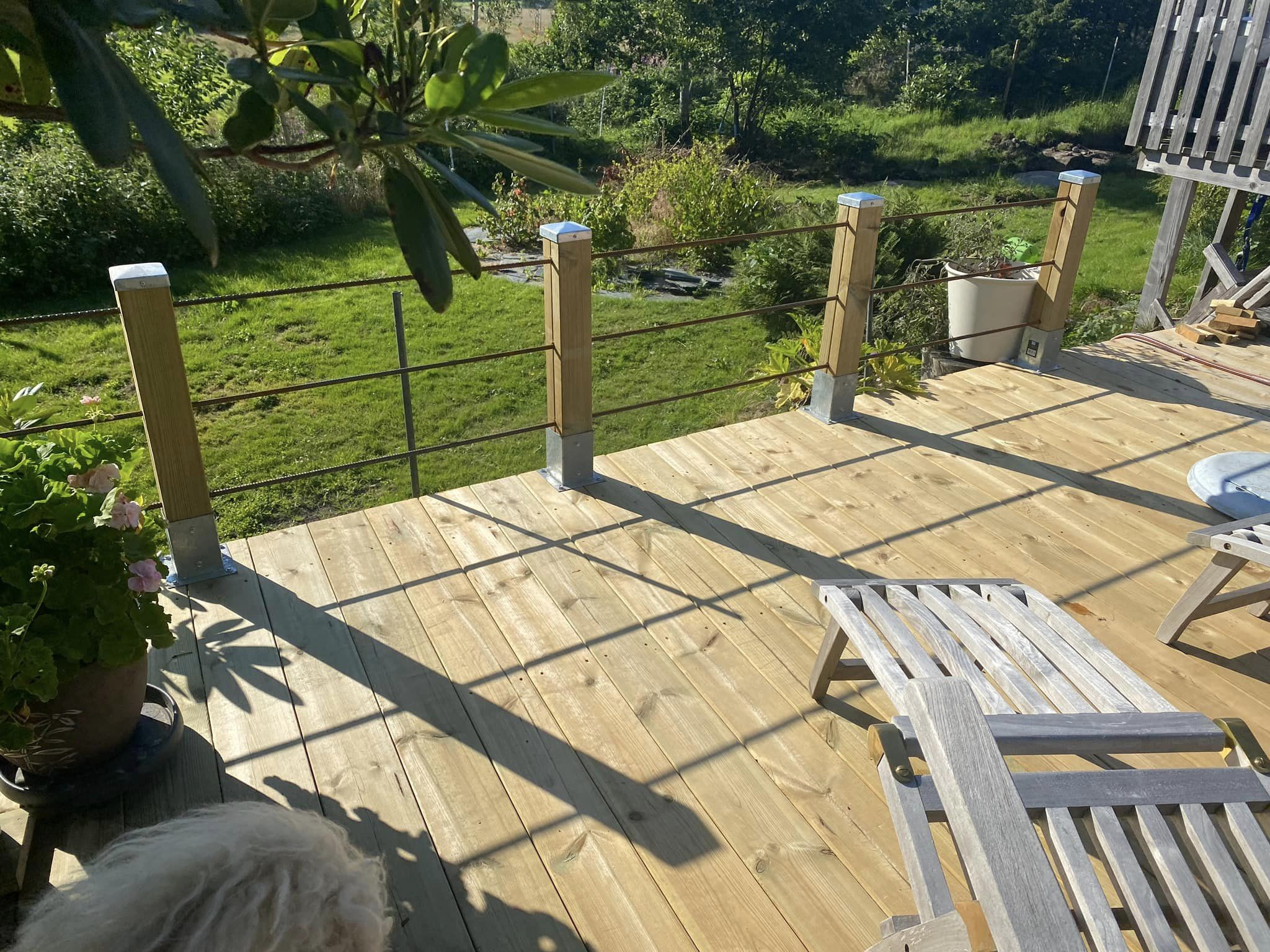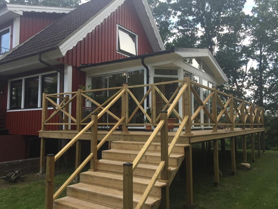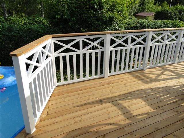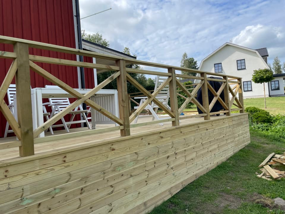 En nackdel kan vara att den dubbla designen kräver mer material och arbete jämfört med enklare räckesstilar, vilket kan öka kostnaden och byggtiden. Dessutom kan underhåll vara något mer omfattande, då både kryssmönstret och ribborna behöver målas eller behandlas regelbundet för att hålla sig i gott skick. Trots detta är denna design ett utmärkt val för dem som vill ha en tidstypisk och stilfull avgränsning på sin altan.