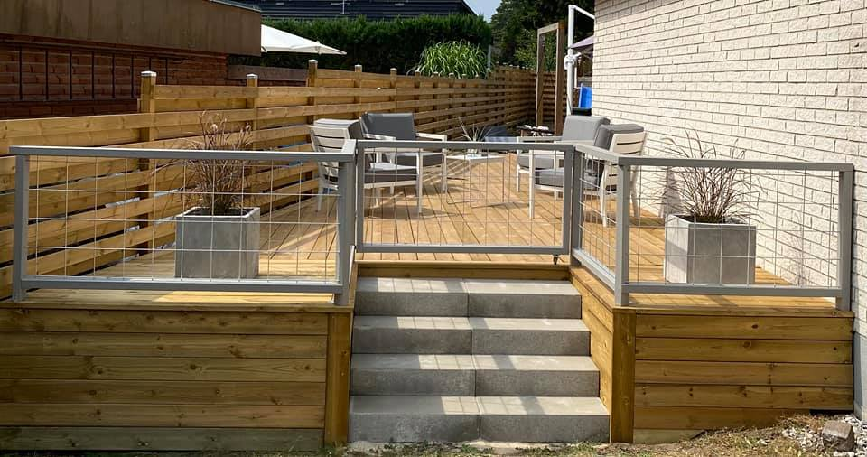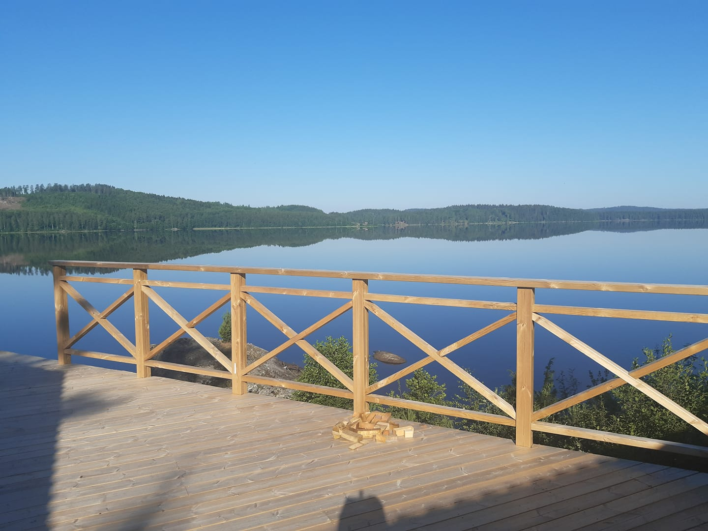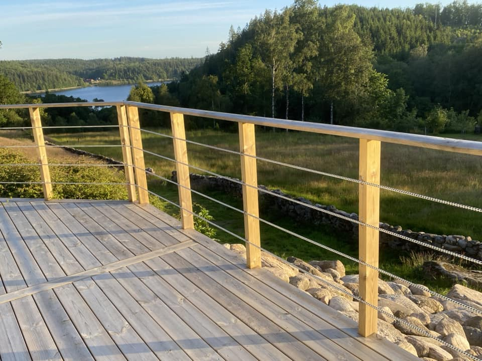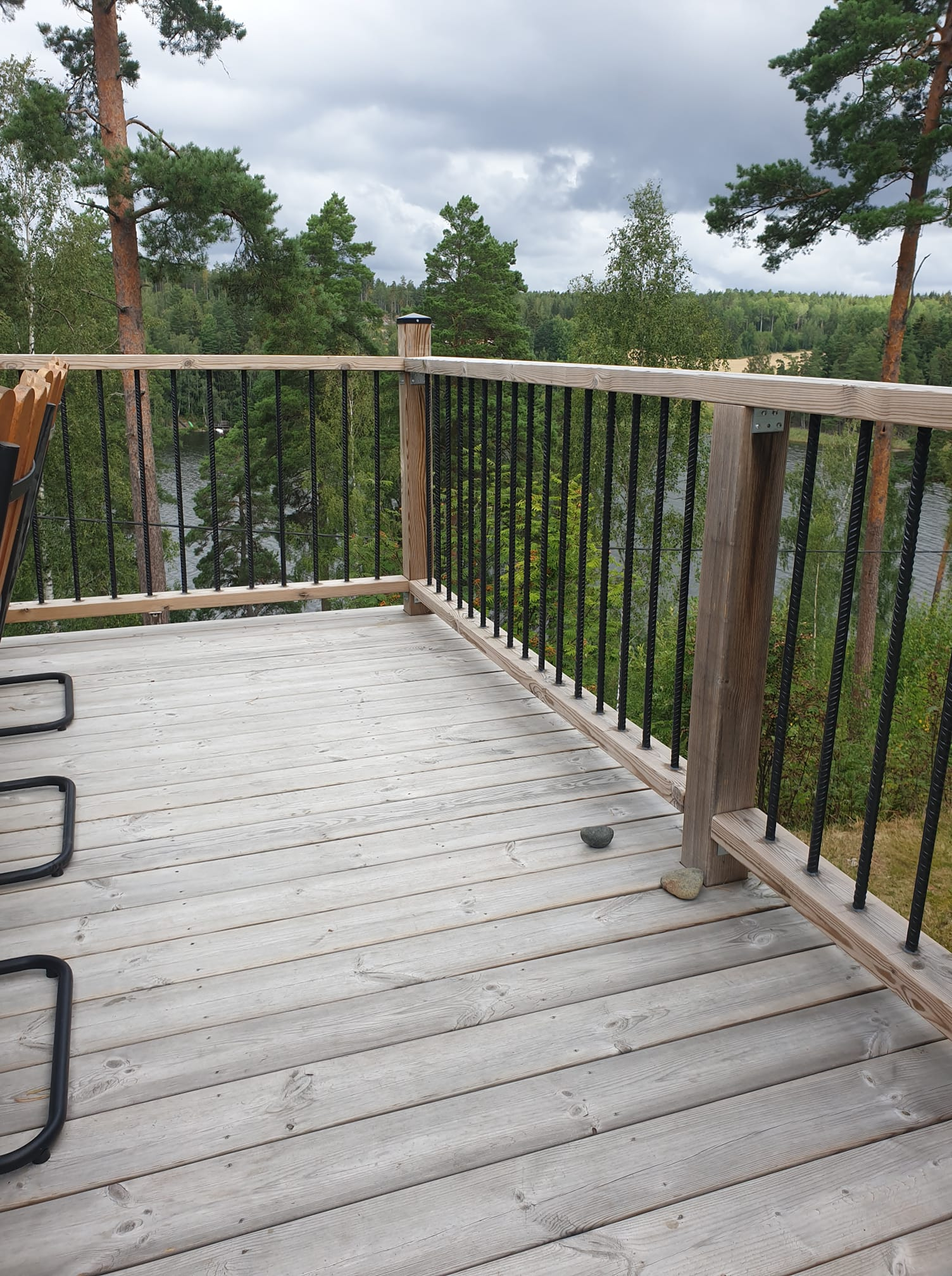 Ett räcke med armeringsjärn erbjuder en modern och industriell look som passar både samtida och rustika utomhusmiljöer. Detta räcke består av horisontella armeringsjärn, monterade mellan trästolpar, som kan kompletteras med en överliggare för extra komfort och stabilitet. Armeringsjärnens tunna, metalliska utseende skapar en minimalistisk och stilren känsla.