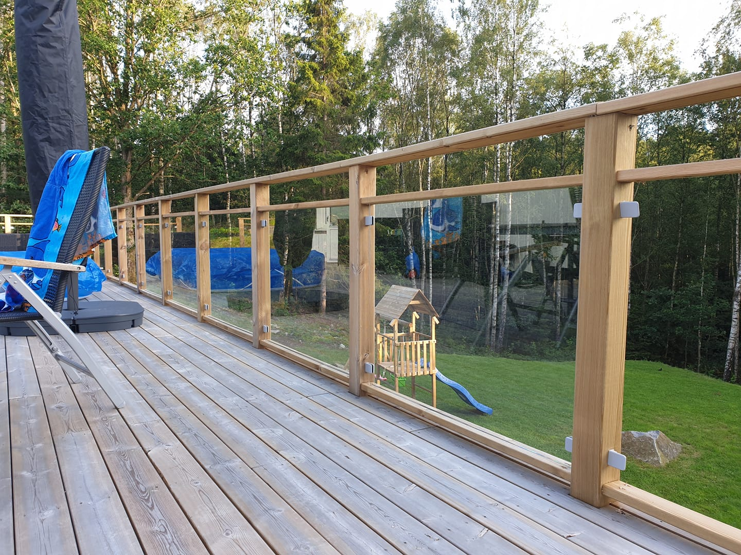 Ett räcke med glas ger altanen ett elegant och modernt utseende, samtidigt som det erbjuder en fri siktlinje över omgivningen. Dessa räcken består av glasskivor som fästs med klämfästen, vilket ger ett stilrent och minimalistiskt intryck. Glasskivorna kan varieras i storlek och utförande, och ibland kombineras de med ytterligare ribbor mellan glasskivan och handledaren för ökad stabilitet och säkerhet.