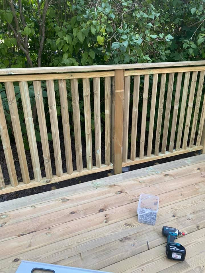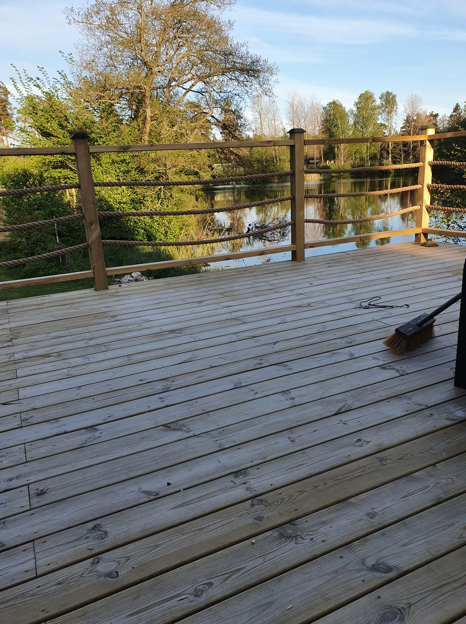 Material: Tryckimpregnerat trä (ribbor, mellanliggare, överliggare), stolpar
